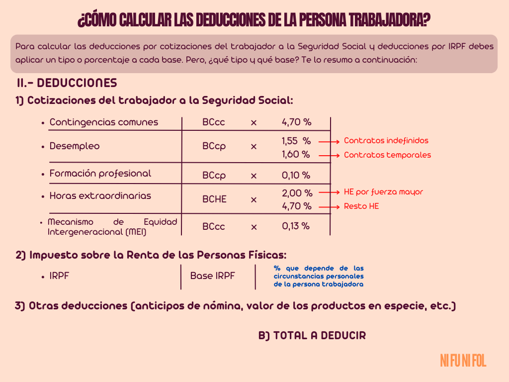 Una vez conocidas las bases de cotización y de IRPF, hay que calcular y sumar todas las deducciones. De este modo, obtendremos el «B) TOTAL A DEDUCIR» de la nómina.