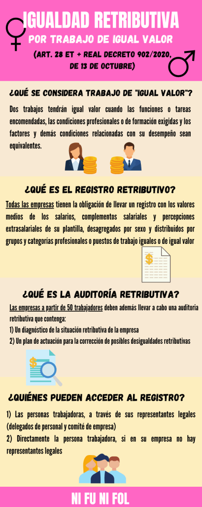 El artículo 28 ET prohíbe la discriminación salarial por razón de sexo; sin embargo, mujeres y hombres no siempre ganan lo mismo, a pesar de realizar el mismo trabajo o trabajo de igual valor. Es lo que se conoce como «brecha salarial», que mide la diferencia porcentual entre los ingresos brutos medios por hora trabajada de las mujeres en comparación con los de los hombres.