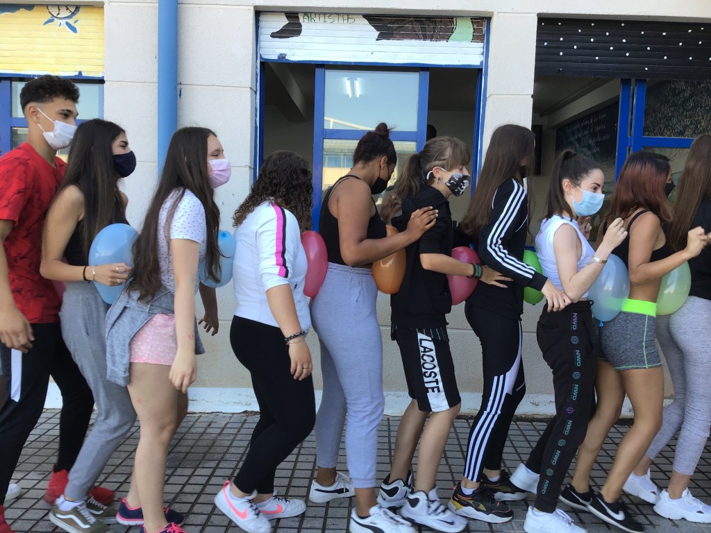 Los alumnos de 1º FPB del IES Libertas (Torrevieja) practican una dinámica de coordinación del equipo con globos.