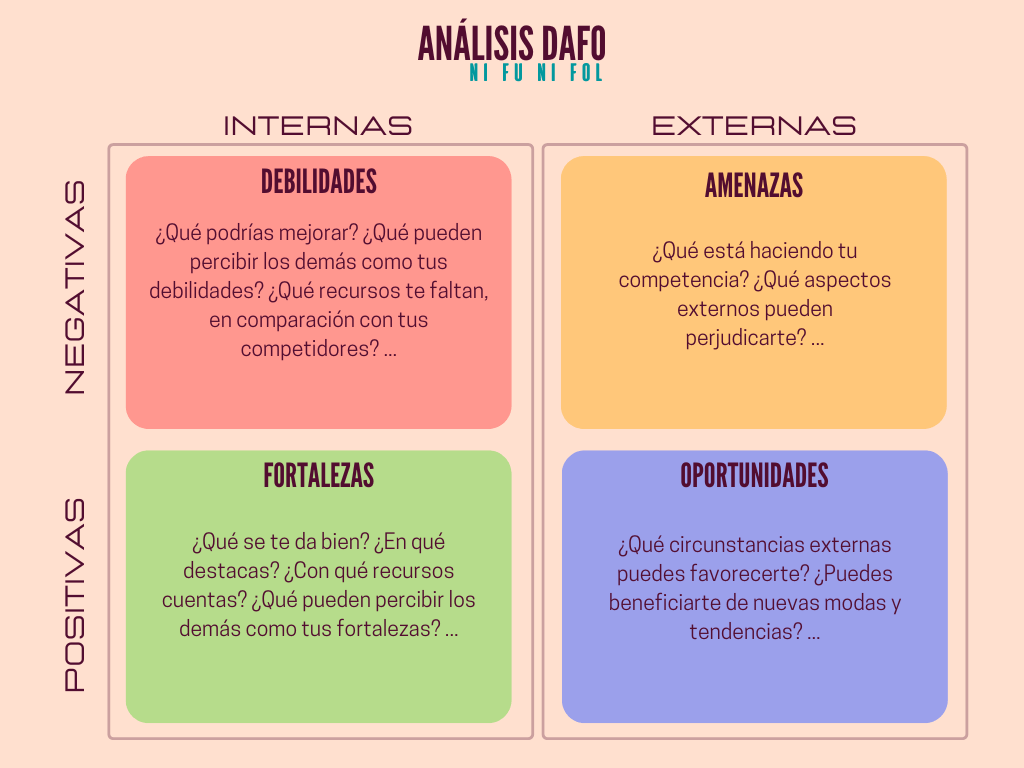 El análisis DAFO (Debilidades-Amenazas-Fortalezas-Oportunidades) es una herramienta que permite al emprendedor analizar la viabilidad de su proyecto empresarial, a partir de la reflexión sobre las debilidades y fortalezas propias, pero también sobre las amenazas y oportunidades procedentes de su entorno.