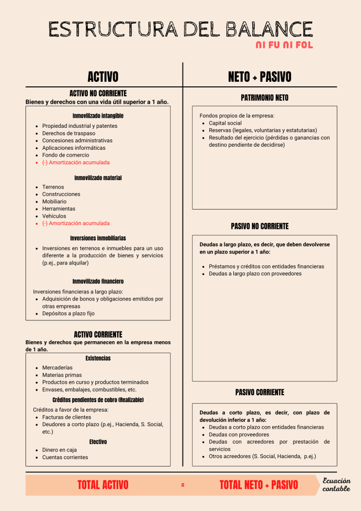 Los elementos del activo se ordenan de menor a mayor liquidez (facilidad para transformarse en dinero), mientras que los elementos del patrimonio neto + pasivo se ordenan de menor a mayor exigibilidad.