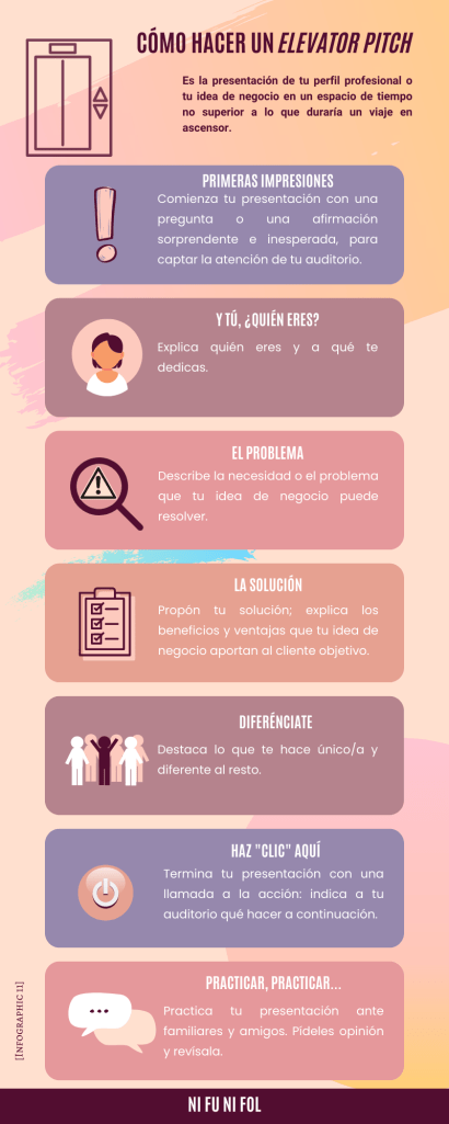 Este vídeo de Alicia Ro nos da las pautas para elaborar un elevator pitch de forma eficiente en siete pasos: