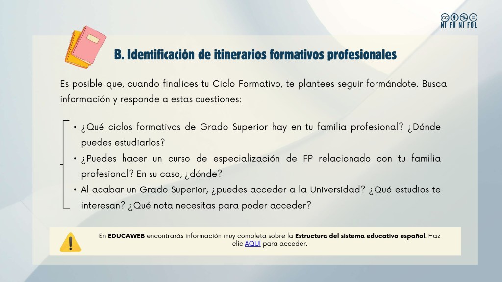 2. Itinerarios formativos profesionales. En EDUCAWEB tienes información completa y detallada sobre los itinerarios formativos del sistema educativo español. Haz clic AQUÍ para acceder a la información.