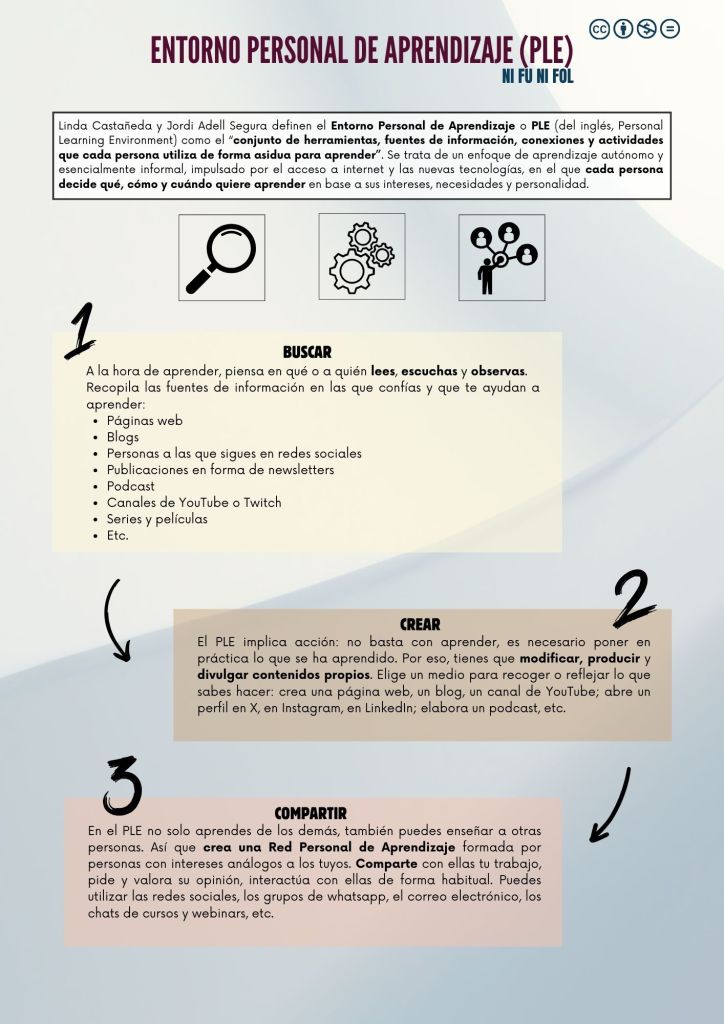 El PLE se desarrolla principalmente en tres fases: una primera consistente en buscar y gestionar información, una segunda de producción de contenidos propios y, por último, una tercera fase de compartir conocimientos con otras personas que forman la Red Personal de Aprendizaje.